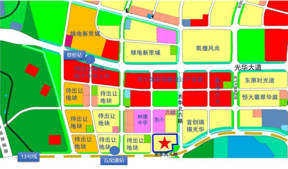 地块紧邻光华八线,西侧距离在建的地铁13号线瓦窑滩站约500米,交通十分便捷。地块北临成都市泡桐树小学绿舟分校,东侧为首创禧瑞光华项目,教育、医疗、生活服务中心等设施正齐头并进,整个区域正在高速发展,房企拿地后可快速上手。