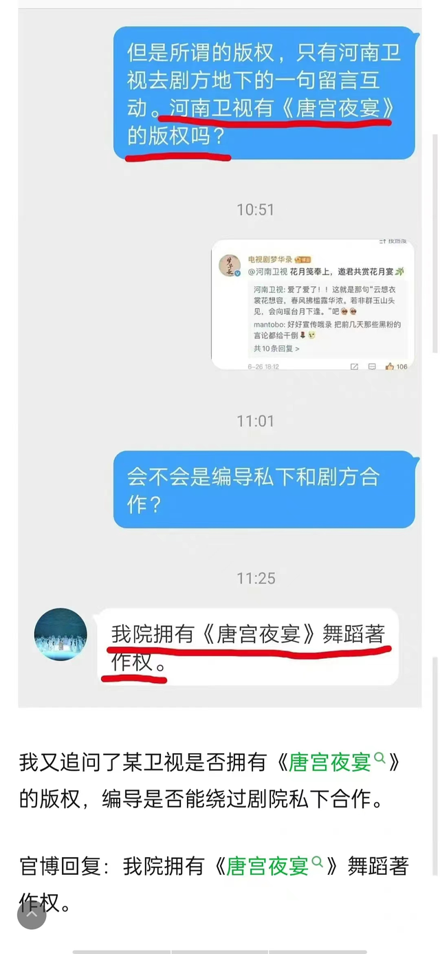 因为河南卫视官博和《梦华录》官博有过互动,网友又继续追问是否有可能是河南卫视编导私下和剧方合作,同样得到了“只有我院拥有著作权”的回答。