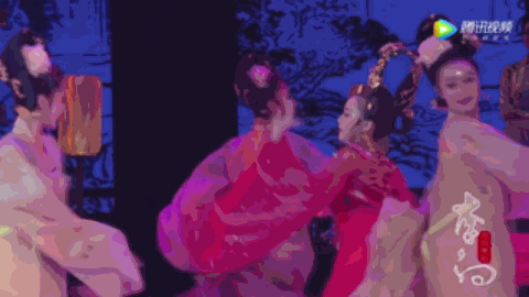 比如这组声称最能证明抄袭的撞飞舞女图,《梦华录》中的动作聚焦于一排舞妓的连续摆手,以及最终从排尾飞出去的动作,反观《唐宫夜宴》里的撞人动作幅度很大,且舞蹈演员站在中心,用了较长时间聚焦凸显这个动作。
