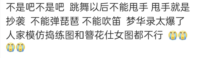 这几组在网上传播,被用来证明《梦华录》抄袭的对比图,仔细看来都有些牵强。有网友表示:难道跳舞只要甩手、亮相就都算抄袭吗?况且这几个都是很常见的舞蹈动作,不能不让别人用吧。