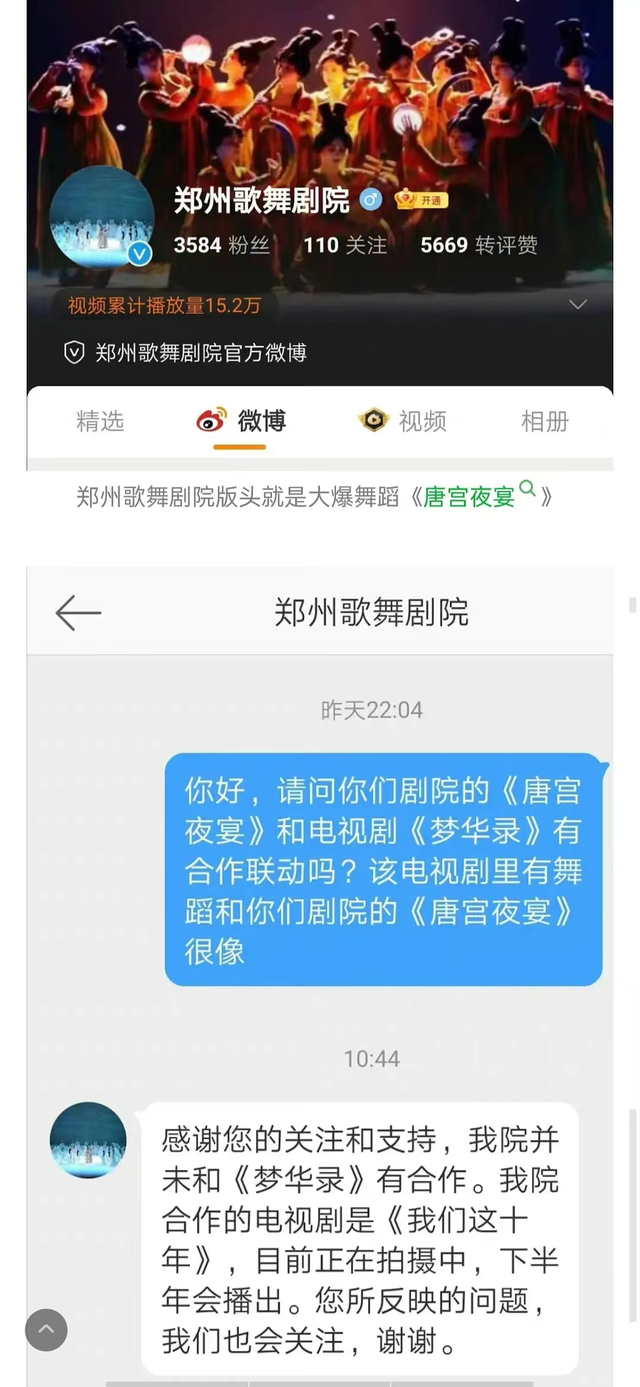 《唐宫夜宴》在河南卫视晚会播出之后,获得了观众们的一致好评,也因此知名度暴涨。有质疑抄袭的网友第一时间联系了郑州歌舞剧院询问是否与《梦华录》有合作,得到了官方“并未合作”的回复。