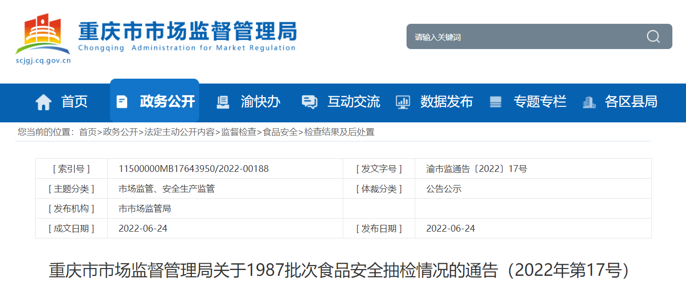 中国质量新闻网讯 2022年6月24日,重庆市市场监督管理局网站发布关于1987批次食品安全抽检情况的通告(2022年第17号)。据通告,奉节县旺发百货超市经营部销售的、标称南昌杰夫食品工业有限责任公司生产的1批次香葱王中王超薄片饼干,过氧化值(以脂肪计)不符合食品安全国家标准规定。检验机构为重庆海关技术中心。