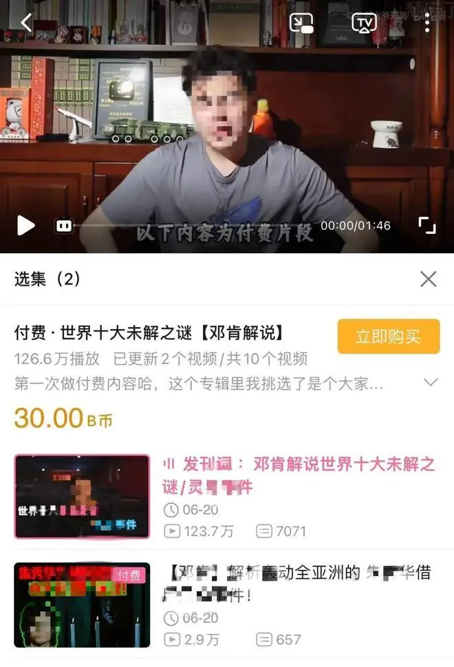 导语:B站UP主@勾手老大爷邓肯推出了一套“世界十大未解之谜”付费视频合集,10集内容收费30元。几天过去,第一集视频播放量仅为2.9万,而这位UP主已经损失了上万粉丝。