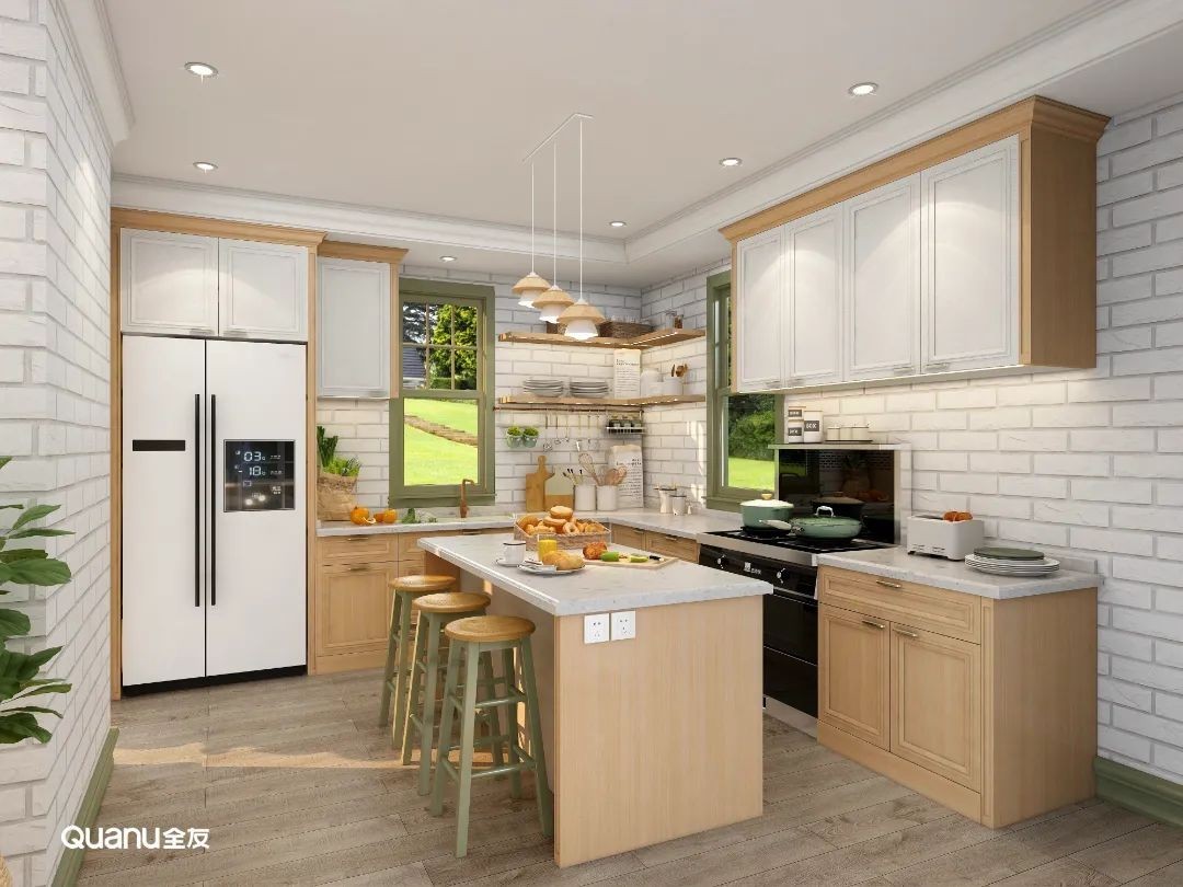 白色经典百搭,是大部分厨房设计的第一选择。白色的橱柜简约大气,搭配流畅的线条,在视觉上有延伸空间的效果,让整个厨房显得更明亮、宽敞、洁净。而且有一点污渍就能够马上看到,方便做完饭后及时清理,让厨房每天都保持干净整洁。