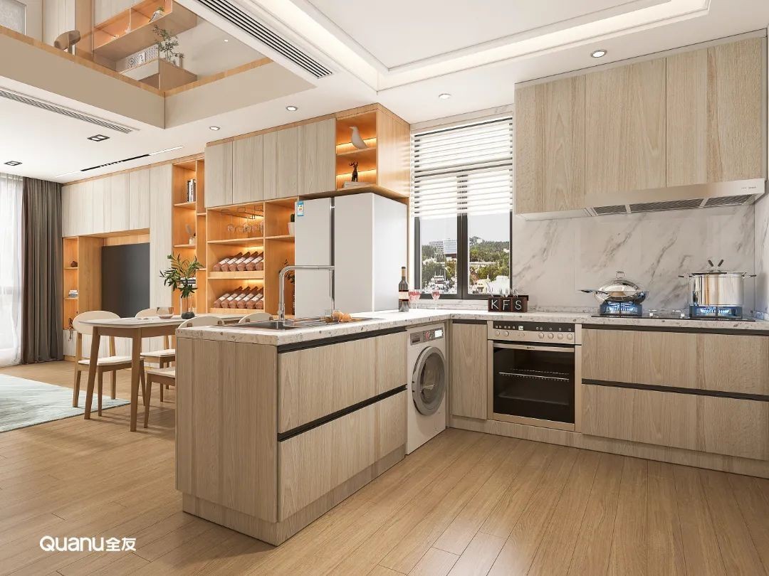 原木色调自带自然质感,给人以温馨舒适的视觉感受,厨房设计采用原木色系,还可以缓解烹饪所带来的劳累感,治愈感满满。原木风格搭配开放式厨房,在这样的环境与氛围中,邀请三五好友一起下厨聚会,何尝不是一种享受。