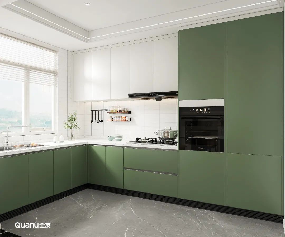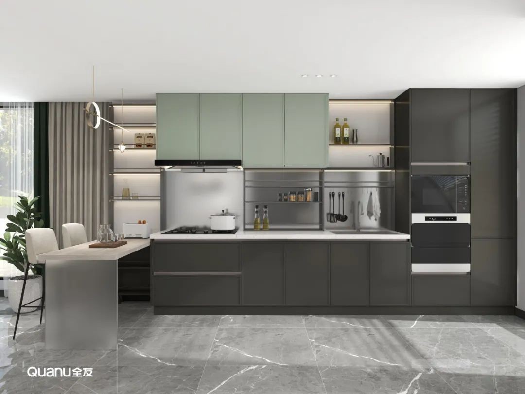 除了常见的白色、灰色和原木色,绿色也是厨房常见的颜色,而不同色调的绿色又可以营造出不一样的烹饪氛围。草绿色、豆绿色淡雅清新,不仅可以为被烟火气包裹的厨房空间注入自然的活力,还有助于情绪的调节与放松,让下厨更轻松自在。