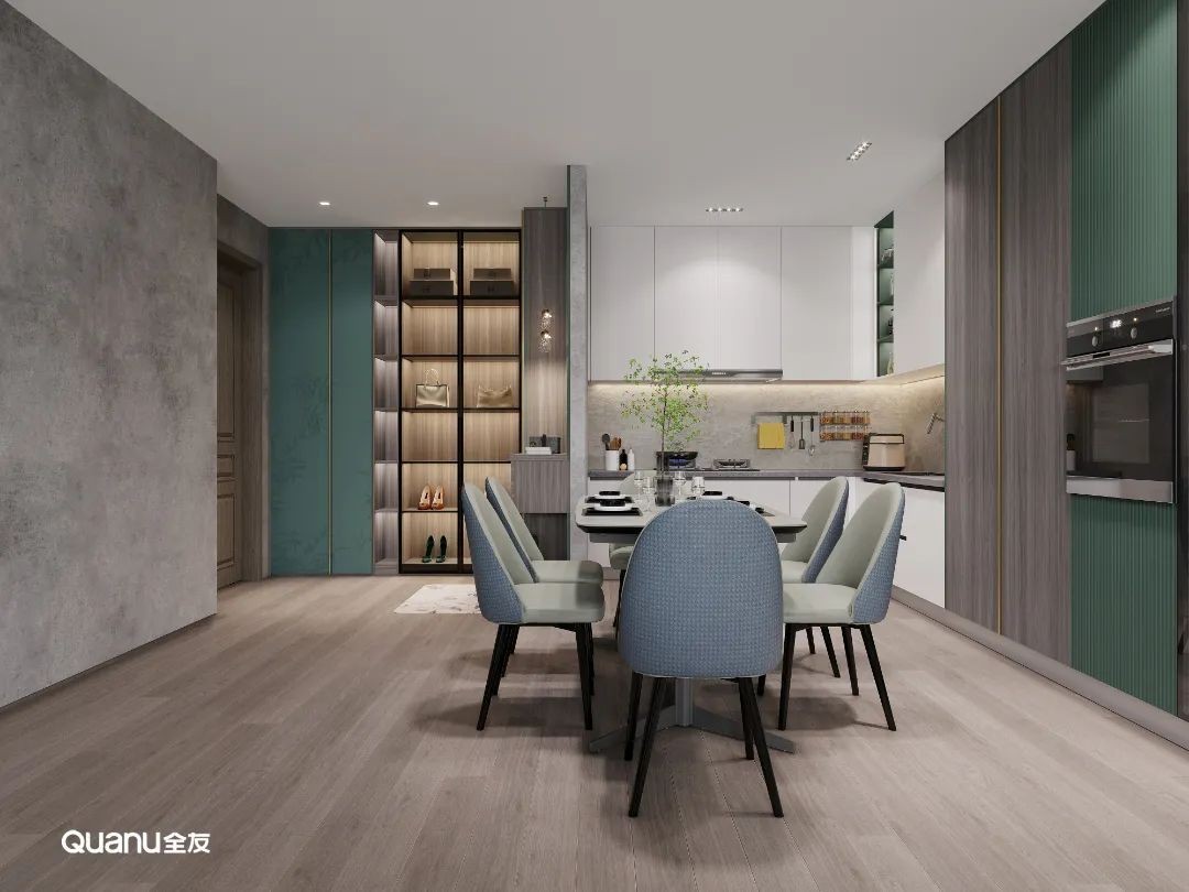 偏深一点的绿色可以带来典雅的复古质感,亦或是韵味十足的中式格调,而同时又不会让人感到压抑,反而赋予了厨房独特的高贵质感,彰显出主人高级的品位。