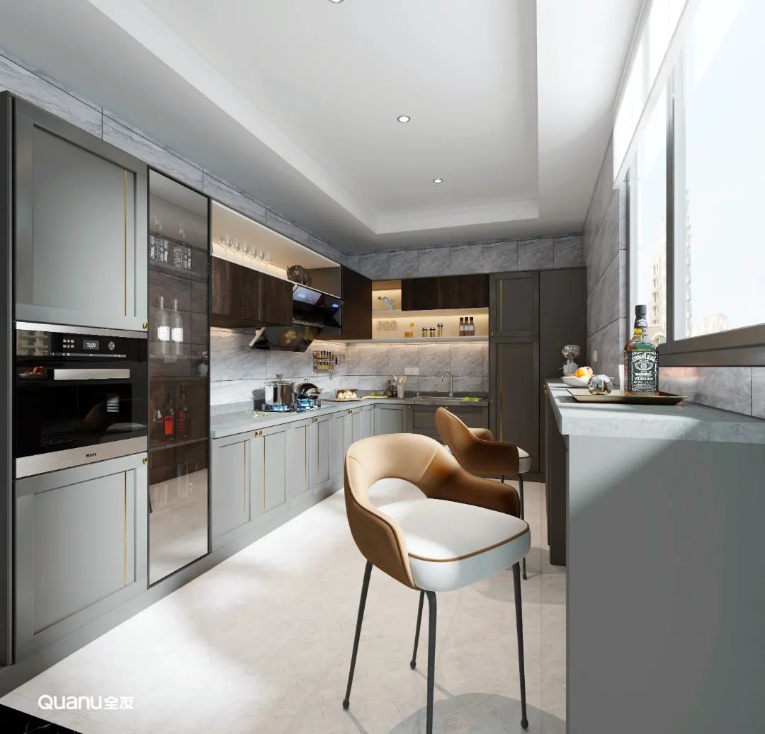 灰色时尚高级,现代感十足,用来装饰厨房也是不错的选择。大气的冷色调构筑了优雅的视觉美感,把艺术格调表现得淋漓尽致,其呈现出来的高端质感让厨房更显井然有序。相较于白色,灰色系厨房最大的优势就是耐脏,不管是尘土还是其它污渍,在灰色面前都不会太明显。
