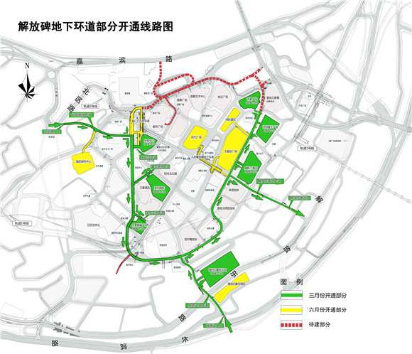目前,该隧道已部分通车,为单向通行,有两个入口即北区路入口(位于临江门佳家玺旁)、储奇门入口(位于长滨路接储奇门行街处)。还有1处出口,即解放东路出口(位于解放东路西三街处)。同时,它连接了约7个停车场(隧道内正在施工,记者实地探访部分停车场入口处于封闭状况)。
