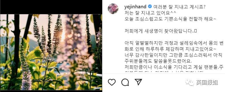 对于和我们一样等待着这个消息的粉丝们和周围朋友们,我们想要及时对你们传达这个消息。我一定会好好守护降临在我们身边的这个宝贵生命,