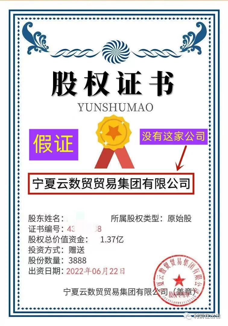 从所谓的“股权证书”之中看到“宁夏云数贸贸易集团有限公司”是编造的,不存在的,在宁夏只有“宁夏云数贸 贸易 有限公司”,这家公司在特大传销“云数贸”平台被打击以后,骨干们都已经获刑了。注册的链接中查到网站服务器在境外,因此这是套牌骗局。