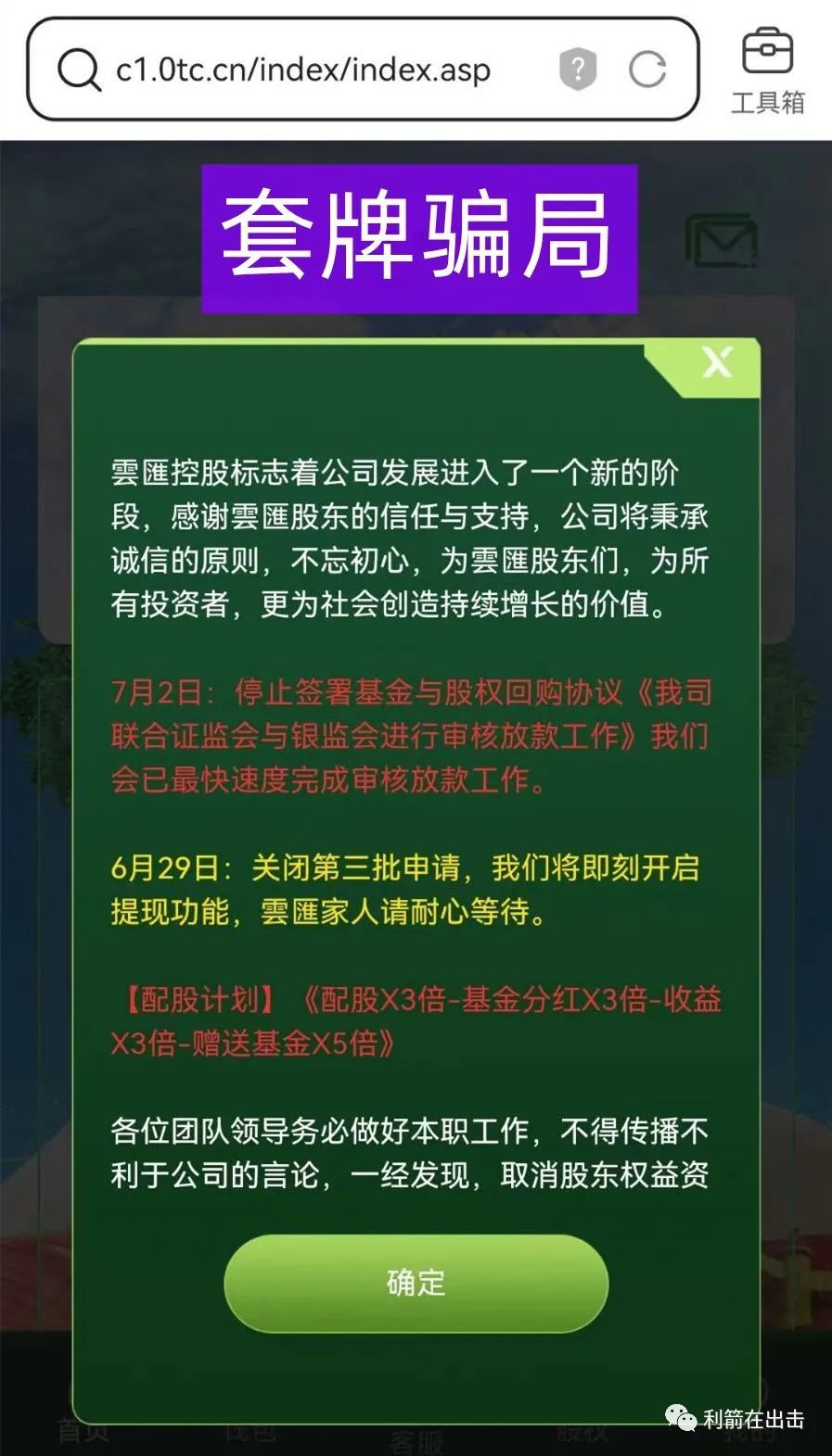 近期又有一批火爆的互联网“投资”项目跑路了,一次次 的 提醒 大家 是骗局,只希望大家不要再被骗。今天再次给大家提醒目前网络之中的一些套牌骗局,什么是套牌?汽车套牌大家都懂,互联网骗局之中,一些骗子们做出一些诈骗app,冒充正规的公司,或者“碰瓷”一些当下的热点进行诈骗,这就是套牌骗局,套牌骗局中有以下几个特点:
