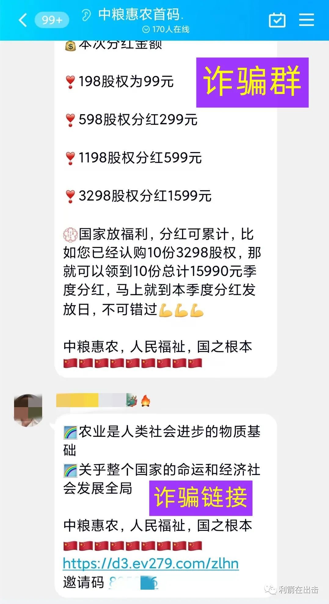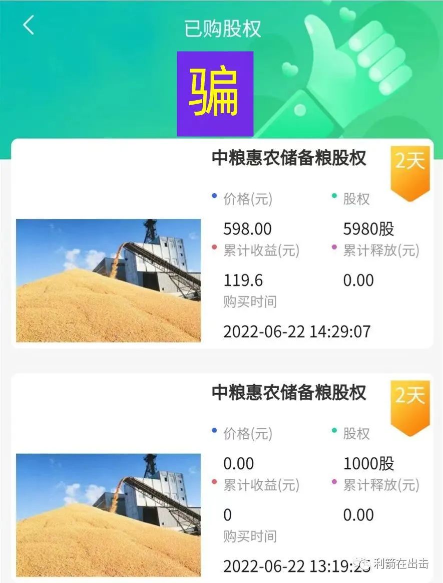 “中粮惠农”是套牌骗局,宣传不同的交钱金额就能获得对应的“股权”,实际是空手套狼的诈骗手法,这个骗局要不了多久就会卷款跑路。