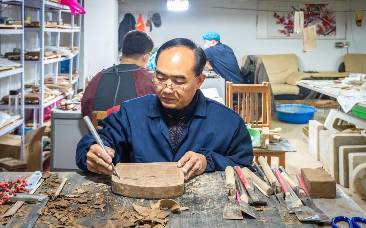 据传承人于德华介绍,一块梁公砚的成型,需要经过22道工序,找泥、晾晒、沉浮,浸泡、沉降、雕刻、打磨、烧制、水磨、包装等,每一步都至关重要,稍有不慎就前功尽弃。从一块胶泥到精美的梁公砚,至少需要一年的时间。