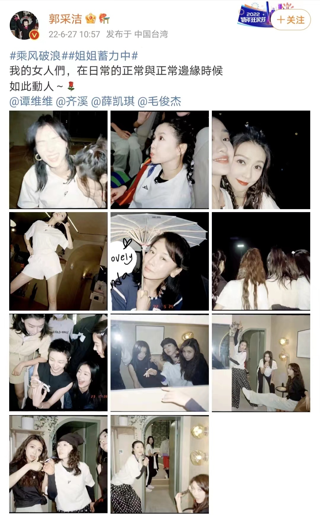 在上周五重新组队结果播出后,郭采洁先后在社交平台上多次分享了《玉》组姐姐们的日常,和队友们一起搞怪地在脸上贴痣、与薛凯琪cos蓝猫与羊驼、一起设计动作拍合照……郭采洁镜头下的姐姐们可爱又有趣,团队气氛更是轻松欢快,堪称乘风破浪隐藏摄影师。贴心的她还发布了自己剪辑的拍照花絮视频并配文“女人堆里捡快乐”,姐姐们也纷纷评论愉快互动,网友们更是笑称郭采洁的评论区已然变成了群聊现场。