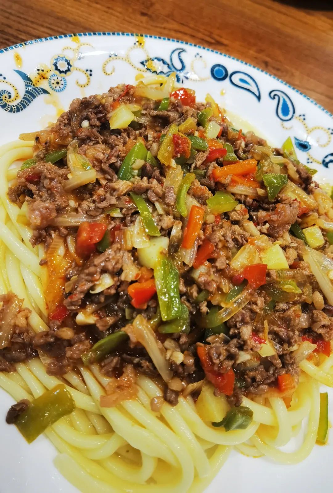 过油肉拌面是拌面里最“豪横”的一道,一大块肉切片,过油捞出,加入青红椒、西红柿、木耳、洋葱翻炒即可,整道菜没有其他的意图,就是奔肉去的