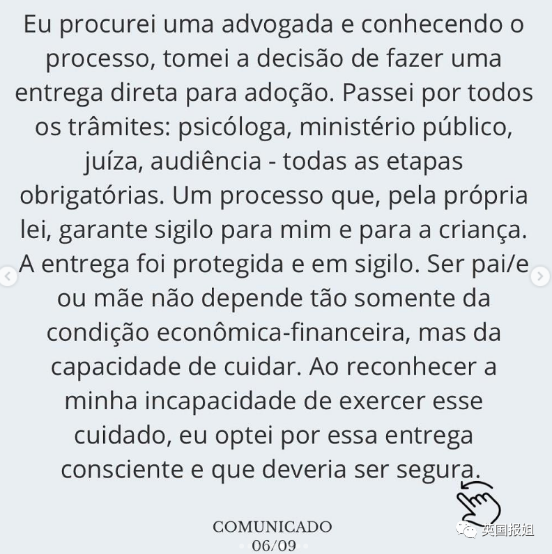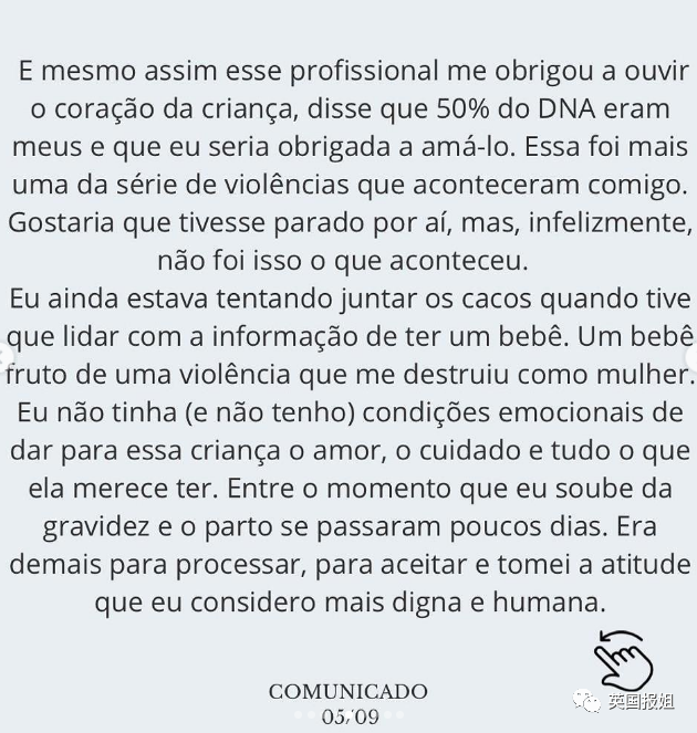 “这个21岁的女孩怀孕后,隐瞒怀孕,甚至在怀孕期间工作,生下了孩子。根据记者Leo Dias掌握的信息,她要求医院抹掉她的出入记录,她甚至不愿意看到孩子的脸!”