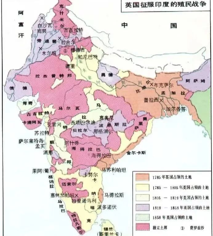 到19世纪中叶,南亚次大陆约65%的土地和75%的人口在英国的直接统治下,余下地区则由分布在南亚各地的上百个臣服于英国的土邦统治。