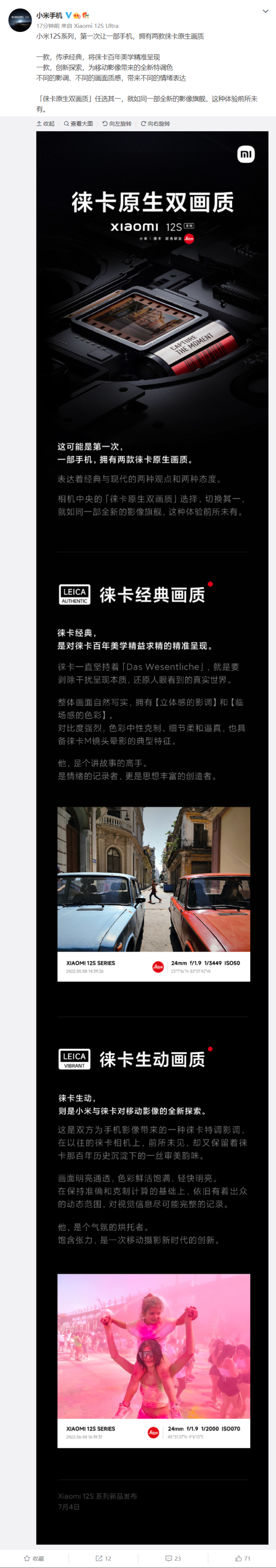 IT之家 6 月 30 日消息,今天小米继续预热小米 12S 系列新品。官方晒出小米 12S 系列首组拍摄样张,徕卡影像除了自带“徕卡水印”外,还支持“徕卡原生双画质”。