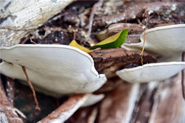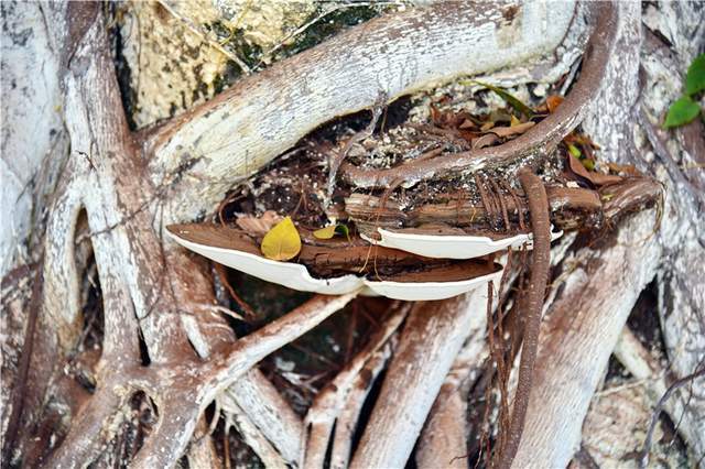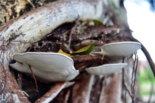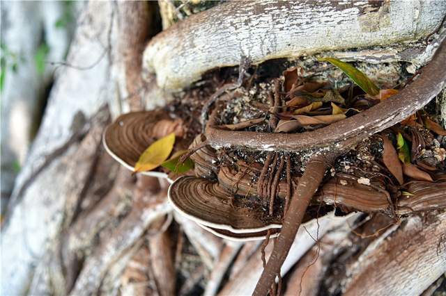 6月30日,我们一行来到了阮埇村一探究竟。大榕树下,几名老人正坐在古石板上打扑克牌。在他们的身后就是那株神奇的大榕树。有两个地方长出了灵芝,都在距离树根部一米内的位置。灵芝从树外面长出来,有很多株,层层叠叠。顶部是褐色,下面是纯白色,表面光滑,呈半圆形,用手摸可以感觉到,灵芝非常坚硬。