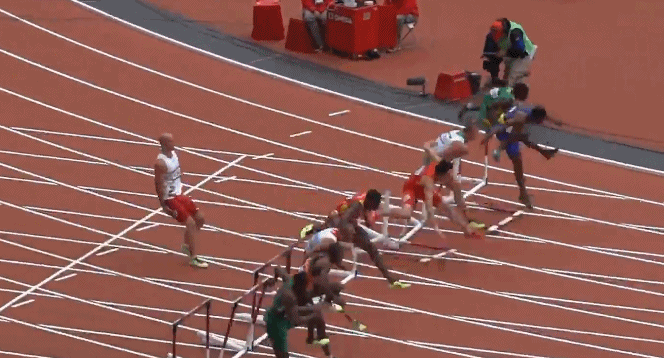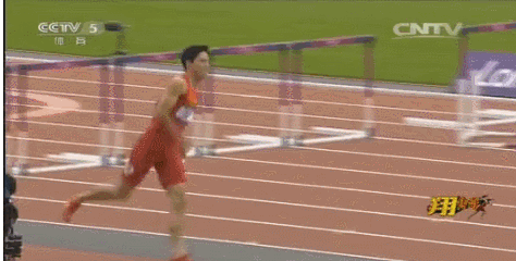 刘翔在攻第一个栏时直接打栏摔倒在地,跟腱断裂,无缘晋级。