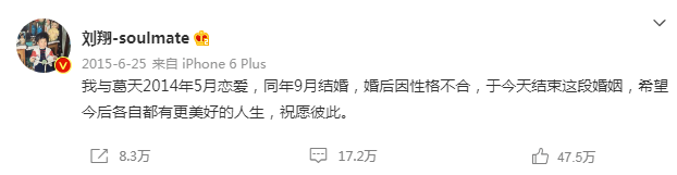 两个月后,刘翔宣布因性格不合,与妻子葛天离婚。