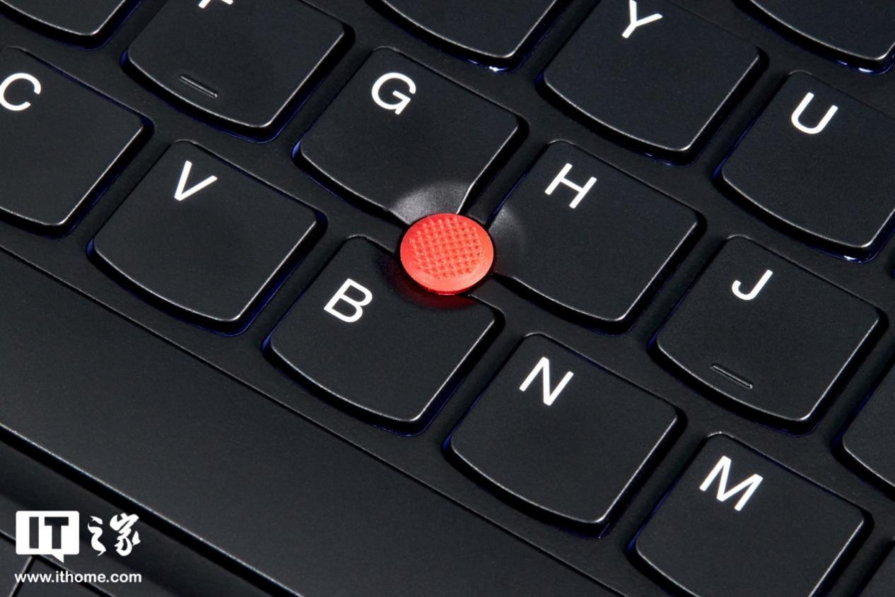 键盘 G、H、B 三个按键中间,还集成了一枚有纹理的红色按钮,也就是 ThinkPad 最具标志性的小红帽。用户可以像摇杆一样通过它移动屏幕光标的位置,并配合触控板上方的物理按键实现鼠标的左右键点击操作,这个设计让用户在进行选择文字等精确操作时能够更加的从容不迫和优雅。
