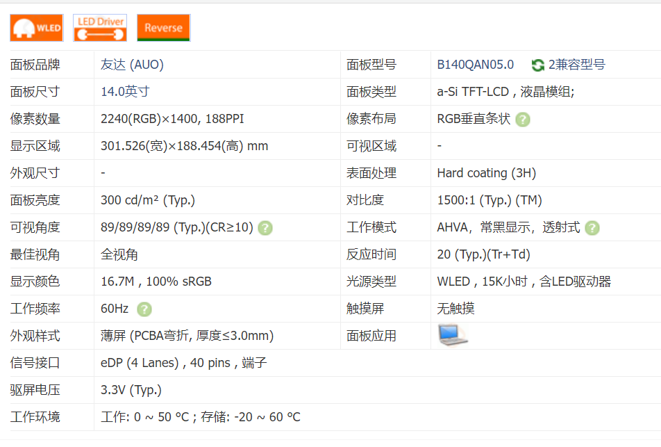 屏幕素质同样是商务人士非常看重的地方,ThinkPad X1 Carbon 采用了一块 2240x1400 分辨率、16:10 比例的 IPS 雾面屏,拥有 100% sRGB 色域和硬件低蓝光技术,我们通过 AIDA64 查询发现,这块屏幕来自友达光电,拥有 188ppi,300nit 亮度,60Hz 刷新率以及 1500:1 的对比度,还拥有 1670 万色的色彩显示。