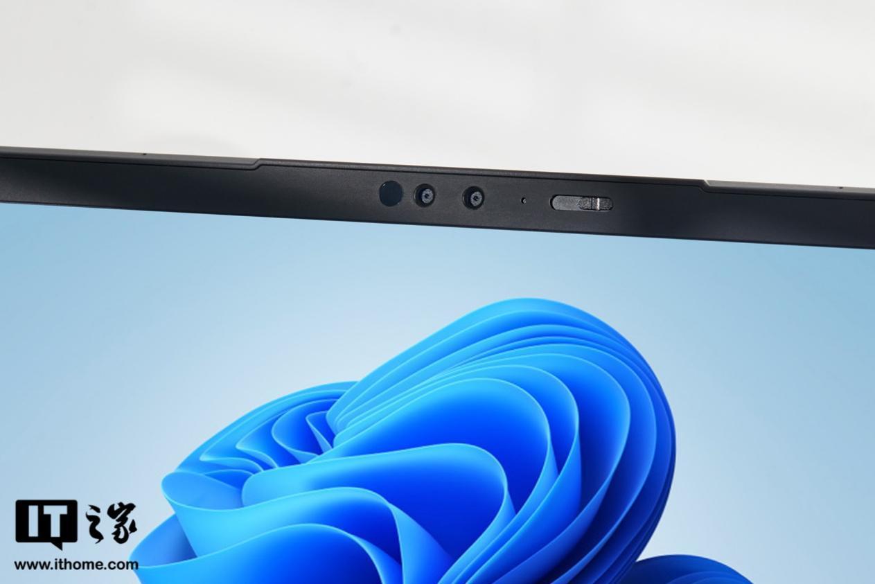 B 面顶部和其他笔记本稍有区别,顶部侧边有四个高质量的麦克风组成阵列,正面拥有一颗支持 Windows Hello 功能的 FHD 摄像头和光距传感器,而且针对商务人士非常在意的隐私问题,专门设计了物理防窥拨片,在不使用摄像头时,用户可以手动拨动物理拨片,挡住摄像头和传感器,此时摄像头处还有 ThinkPad 系列标志的红色小点做状态提醒,从而最大程度保护用户隐私,杜绝流氓软件和权限对用户造成的困扰。