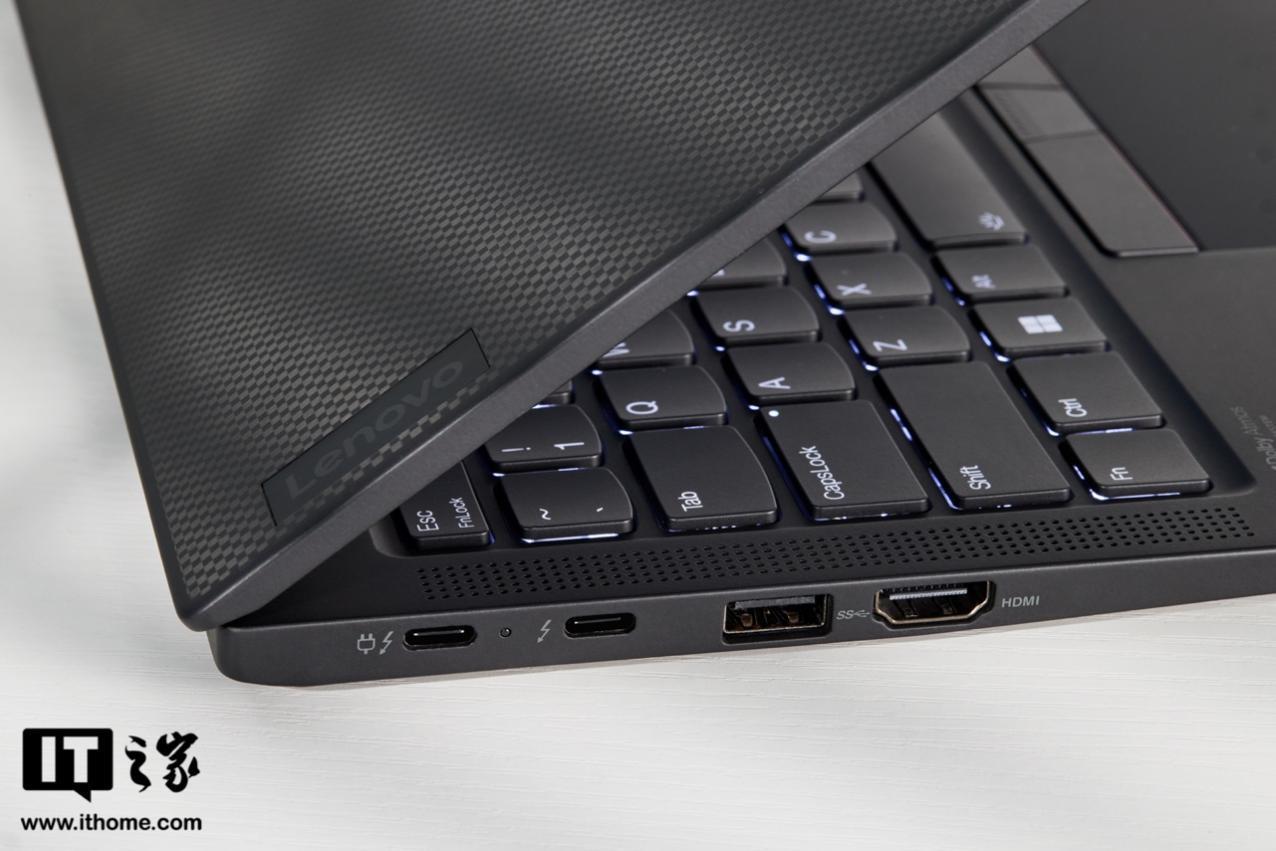 接口部分,由于轻薄机身的限制,接口数量注定不会太多,但是该有的都妥妥配齐,左侧提供了 2 个雷电 4 协议的 USB-C 口,一个 USB3.2 Gen1 Type-A 口以及一个 HDMI2.0b 接口;