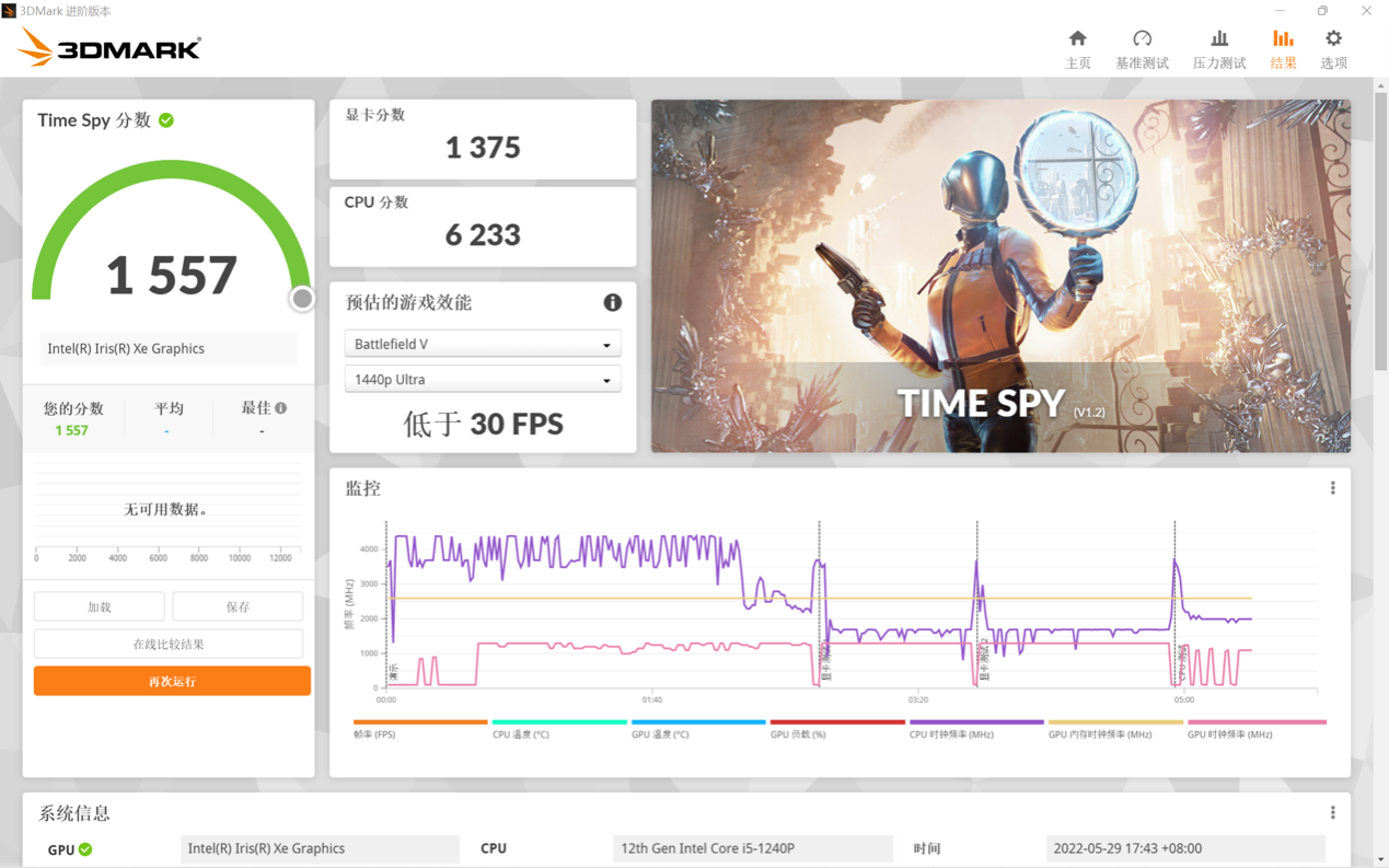 再来看 GPU 的部分,虽然是 Intel Iris Xe 核显,但是通过 3D Mark 的 Time Spy 基准测试可以看到,1557 分的成绩远超桌面端 i7 12700 的 UHD770 核显,放到整个 Intel 阵营的核显表现中都是比较不错的,所以说 i5 1240P 这颗 CPU 非常适合轻薄本来使用。