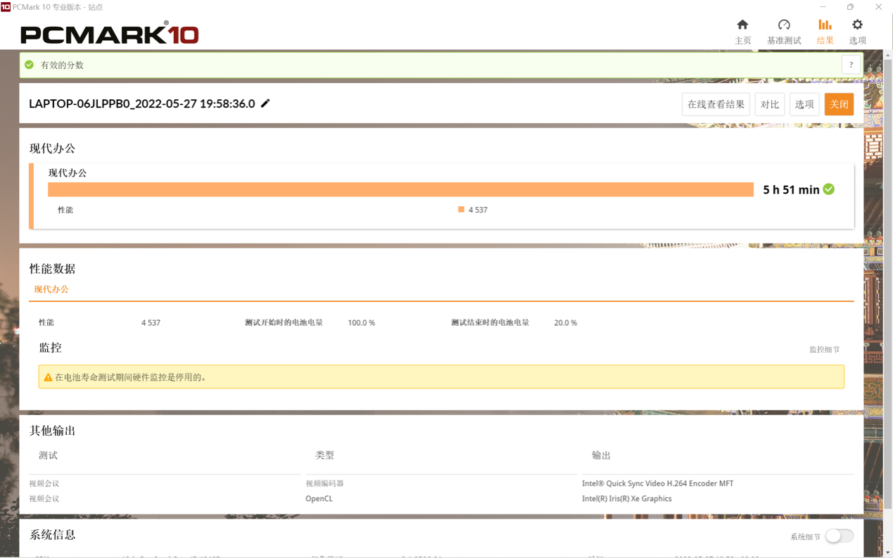 最后来看一下 ThinkPad X1 Carbon 的续航表现,它配备了一块 57Wh 的电池,适配器功率则是 65W 的,可实现快充,在 PC Mark 10 的现代办公续航测试中,得到了 5 小时 51 分的续航成绩,表现中规中矩。