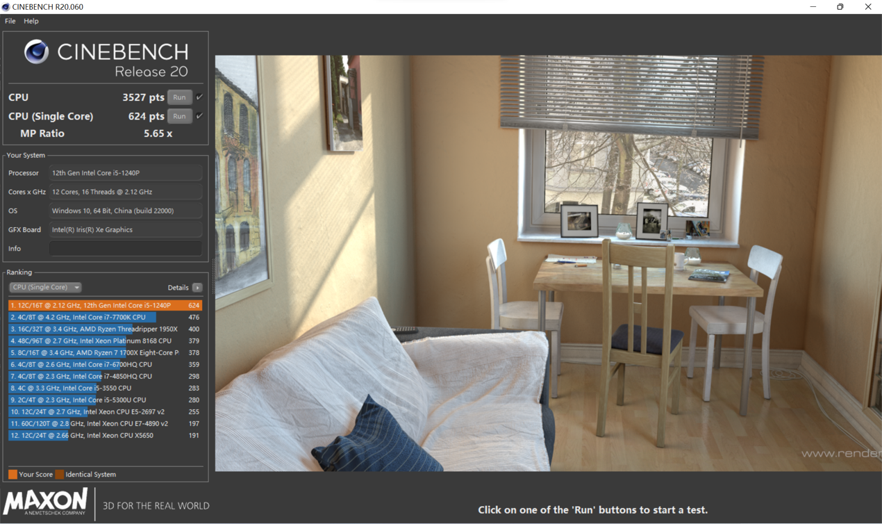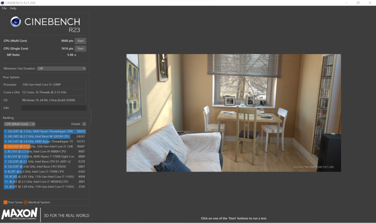 在 CineBench R20 中,i5 1240P 获得了单核 624 分、多核 3527 分的成绩,而在 CineBench R23 中,更是拿到了单核 1616 分、多核 9660 分的成绩,这两组数据直接超越了 11 代桌面端的酷睿 i5 11400H,也几乎追平了 AMD 平台的 Ryzen7 6800U。而功耗方面,i5 1240P 却只有 28W,足见这颗 CPU 的恐怖潜力。