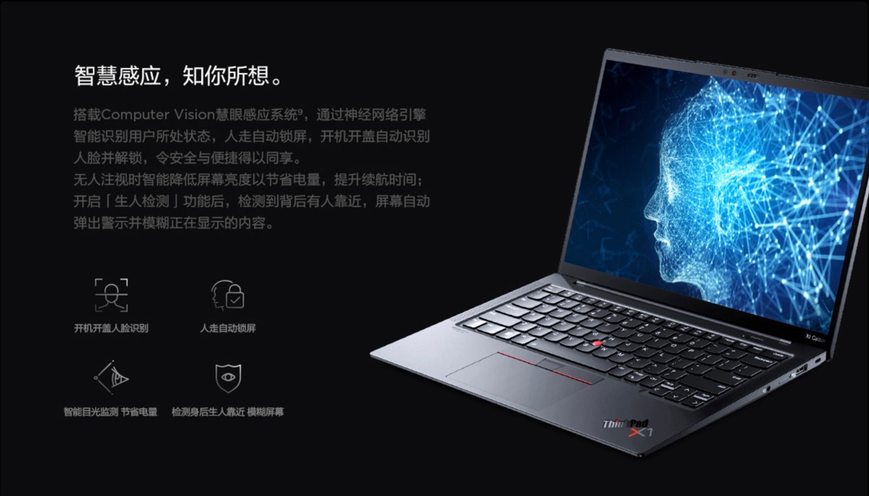 大家可能也注意到了,整个摄像头和传感器占据了不小的空间,数量也比其他笔记本多一些。实际上,这套组合共同构建了 ThinkPad X1 Carbon 的 Computer Vision 慧眼感应系统。它赋予了这台电脑四个功能。