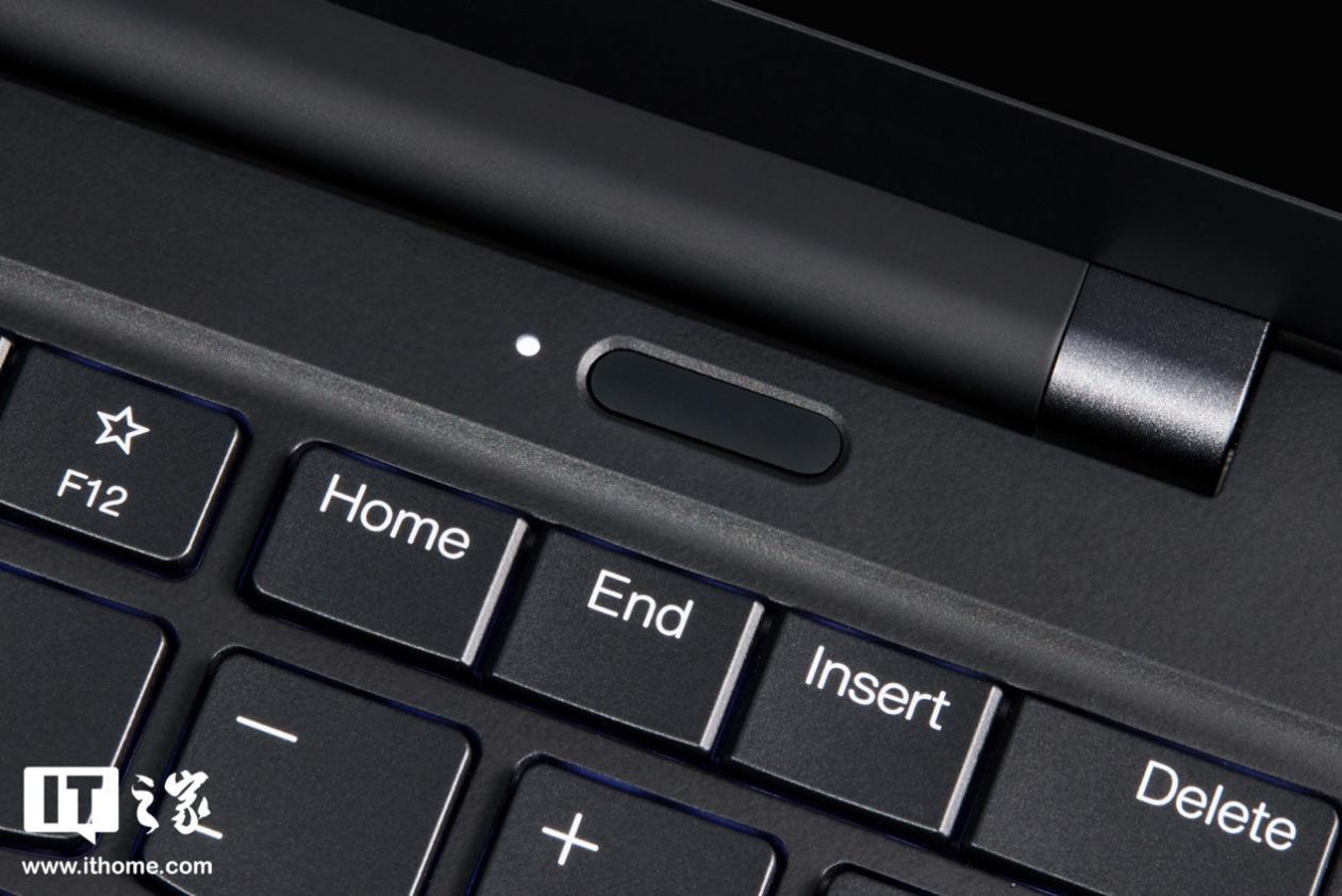 C 面同样采用了类肤质涂层。顶部左侧是一个椭圆形的电源键并集成指纹识别,开机即可一键启动,旁边有一颗白色的电源指示灯,可以显示电脑运行状态。