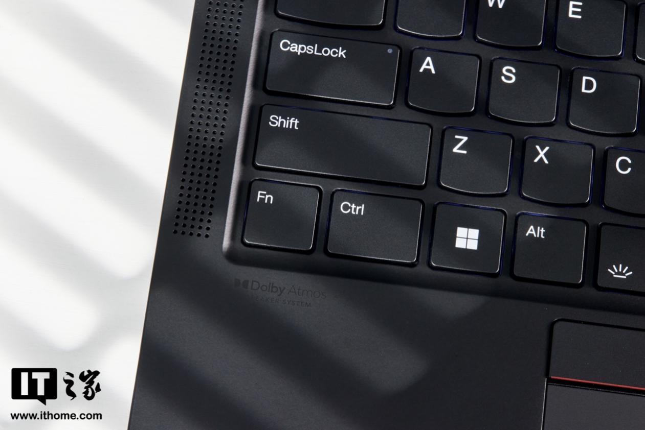 除此之外,键盘两侧还有一对支持杜比音效的双扬声器开孔,左侧印有杜比音效标识,右侧掌托位置靠下处也有一个和 A 面差不多的 ThinkPad X1 标识,只是这个标识的字母“i”不再发光,整个 C 面不论是材质观感还是实际使用的体验,都给人留下了深刻独特的印象,算得上这台 X1 Carbon 设计最出彩的一面了。