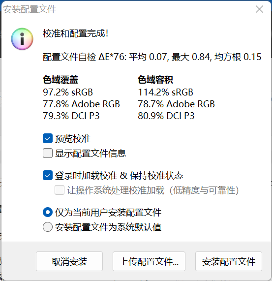IT之家通过专业校色仪配合 DisplayCal3 软件对这块屏幕的色域和色准进行了测试,实测其覆盖了 97.2% 的 sRGB、77.8% 的 AdobeRGB 和 79.3% 的 DCI-P3 色域。