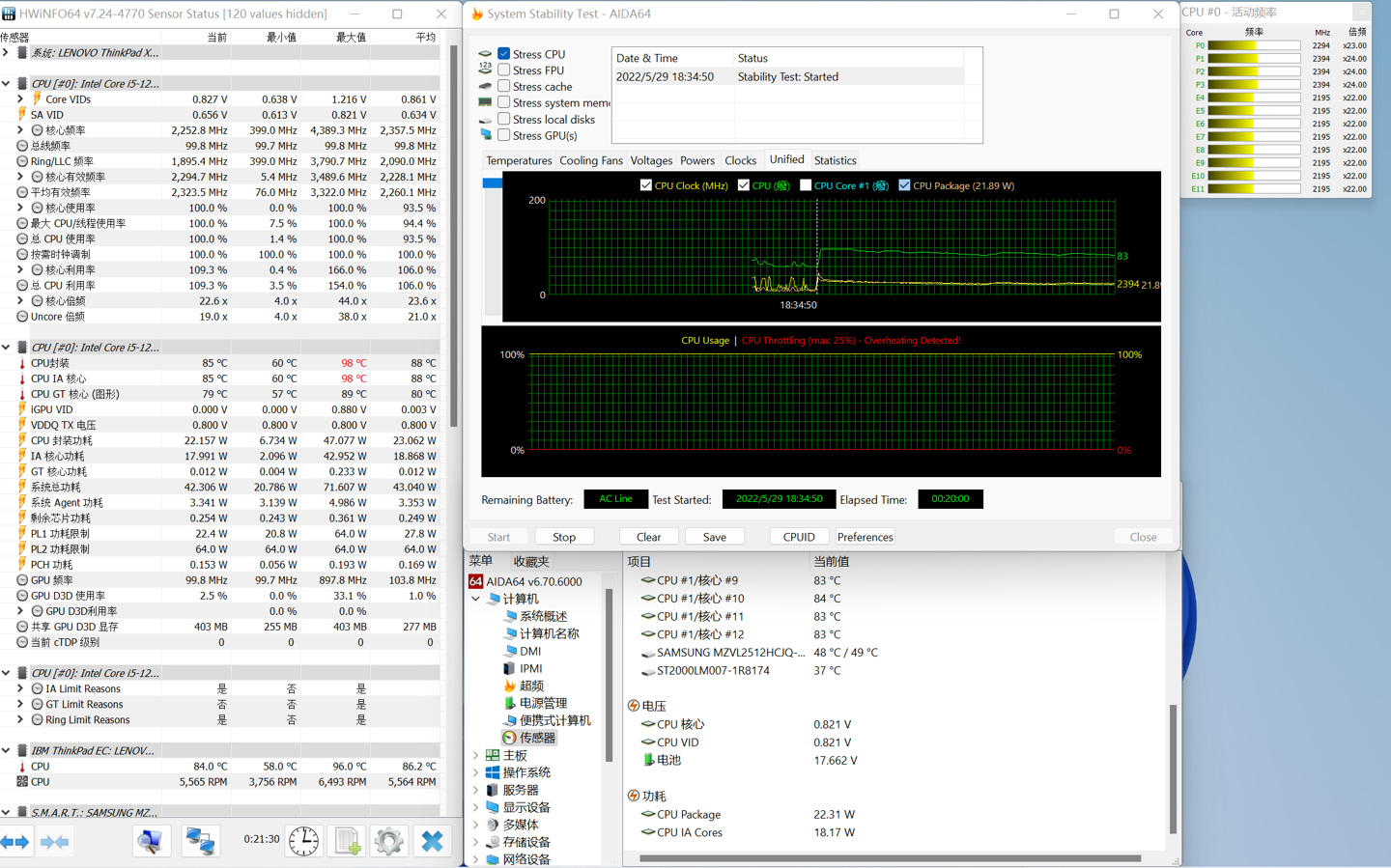 当然,轻薄本的散热也是大家非常关心的一个点,在室温 26 度的环境下,通过 AIDA64 的 CPU 单烤 20 分钟,CPU 平均温度约 85 度,平均功耗 22W 上下。考虑到 ThinkPad X1 Carbon 的轻薄机身,这种偏保守的功耗策略是有合理性的,毕竟如果功耗给很高,那噪音和键盘面的温度可就 Hold 不住了。