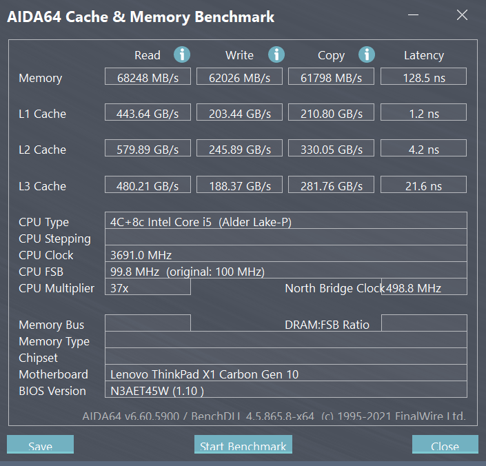 内存方面,ThinkPad X1 Carbon 给到了 16GB DDR5 6400MHz 双通道的规格,实测读写拷贝的速度都超过 60000+ MB/s,表现非常给力。