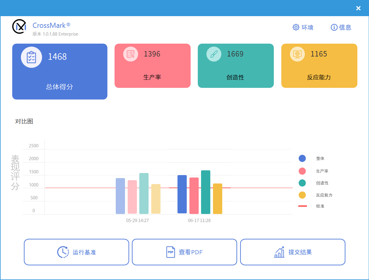 由于 ThinkPad X1 Carbon 定位商务人群和办公生产力能力,所以我们也对一些实际的生产力工具和场景进行了测试。首先在 CrossMark 基准测试中,综合得分来到了 1468 分。