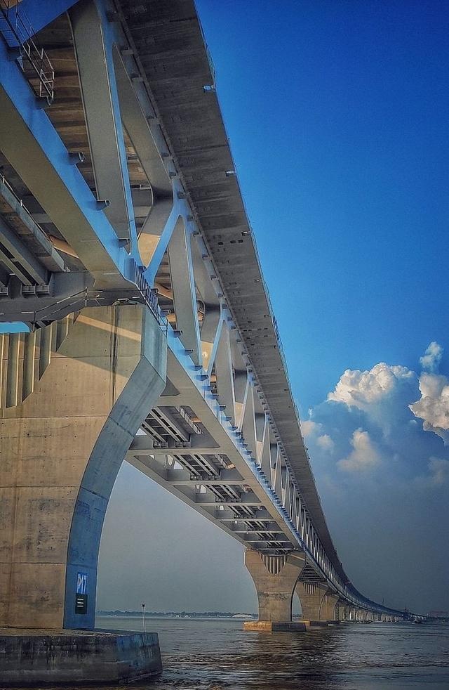 这条帕德玛大桥起于孟加拉国首都达卡,连接了达卡与南部的21个地区,至杰索尔为终点,全长约为7.7公里。这个耗时八年完成的项目,结束了孟加拉国千年以来的摆渡历史,为孟加拉国人民将通行时间从7、8小时缩短至10分钟。