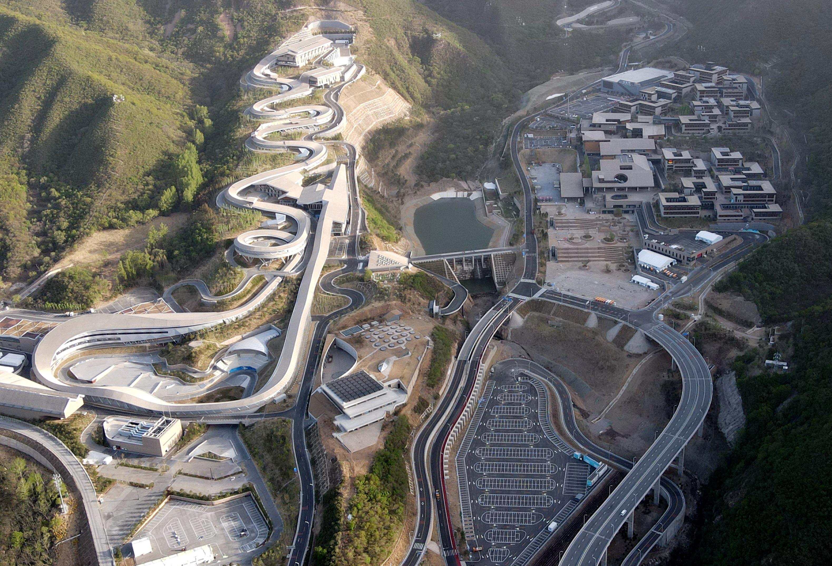 这是4月26日拍摄的国家雪车雪橇中心(左)和冬奥村(右)(无人机照片)。新华社记者张晨霖摄