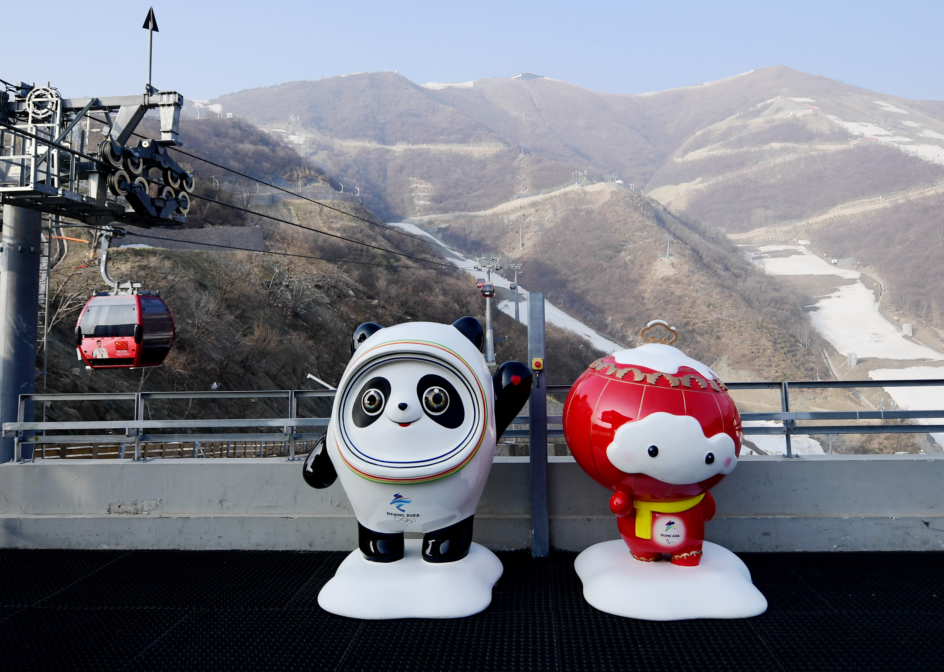 这是4月25日在国家高山滑雪中心拍摄的北京冬奥会、冬残奥会吉祥物“冰墩墩”和“雪容融”。新华社记者张晨霖摄