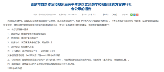 6月30日,青岛市自然资源和规划局官网发布了李沧区文昌路学校规划建筑方案批前公示。