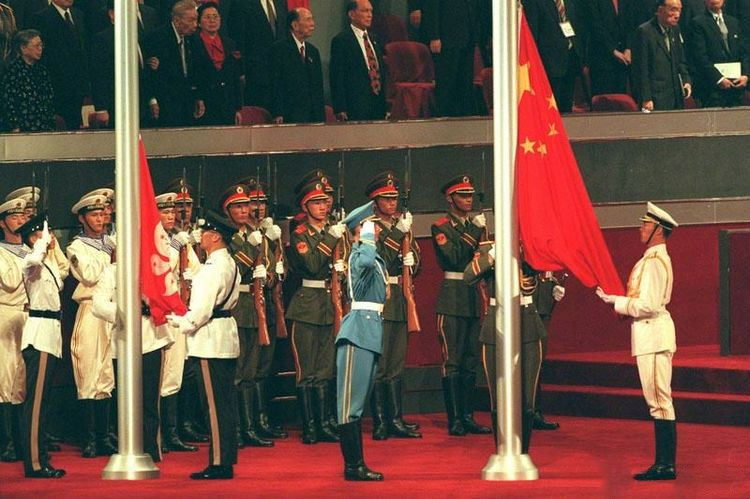 7月1日零时,中华人民共和国国旗和香港特别行政区区旗在香港升起。同一时刻,在港岛中区添马舰军营,五星红旗也在这里升起,以此为标志,中国顺利接管香港防务。