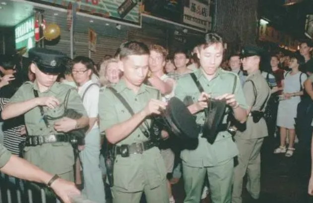 正在街头执勤的香港警察换带上了香港特别行政区的警徽。