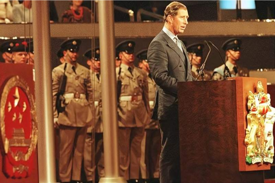 在仪仗队行举枪礼之后,查尔斯王子讲话。他说,这一重要而特殊的仪式,标志着香港在150多年英国统治之后,交还给中华人民共和国。