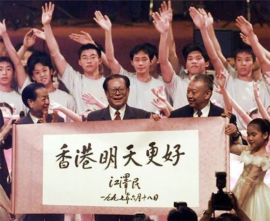 在香港特别行政区成立庆典上,两位儿童展示江泽民主席题写的“香港明天更好”书法卷轴。