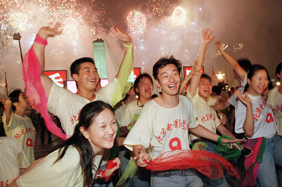 大学生们在天安门广场庆祝香港回归。