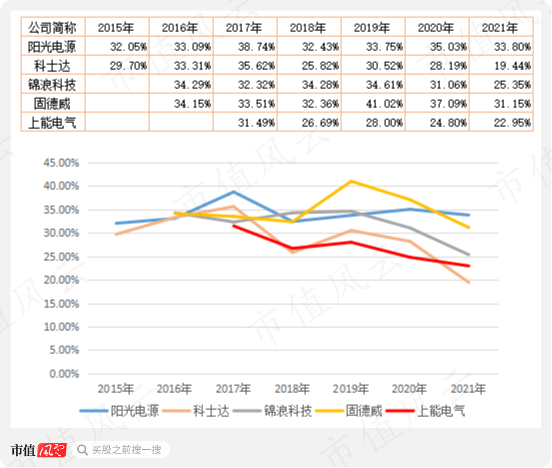 而从毛利率看,整体都呈现下降趋势,固德威的毛利率较高,阳光电源的毛利率最低,上能电气居中。